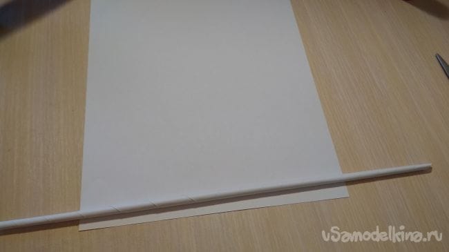 Возьмём ещё один лист бумаги, приложим к нему тонкую трубочку так как показано на фото и скатаем одну толстую трубочку: