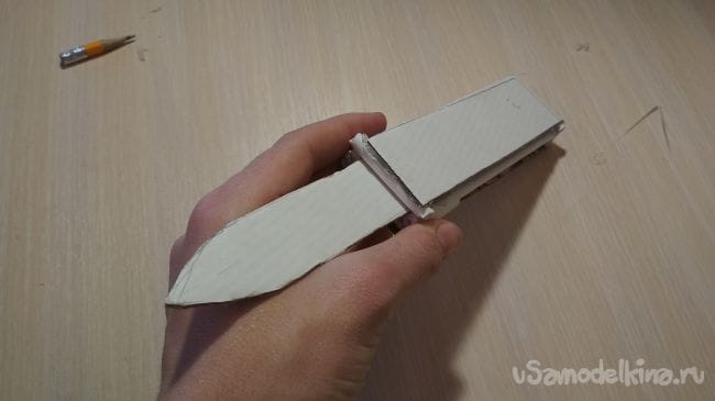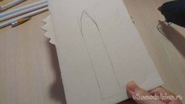 Берем карандаш, линейку и на картоне начинаем рисовать клинок как вам нравится, главное чтобы по длине он был чуть длиннее чем половинки той тонкой трубочки которую мы разрезали по полам, ширина должна быть 2 см: