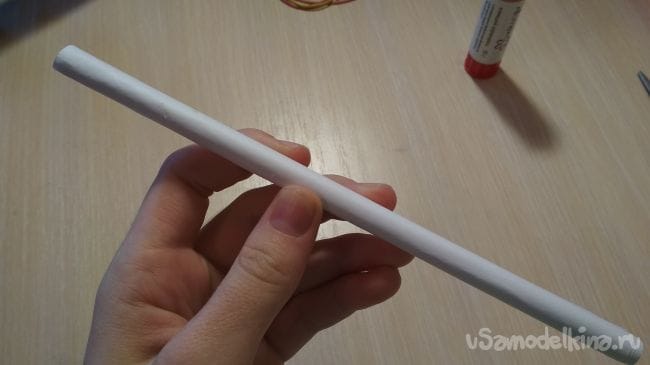 И так первым делом нужно скатать 2-3 тонкие трубочки из бумаги (количество трубочек зависит от размера вашего "клинка") для того чтобы скатать тонкую трубочку нужно сначала раскатать край, а потом просто скатываем дальше и в конце склеиваем край: