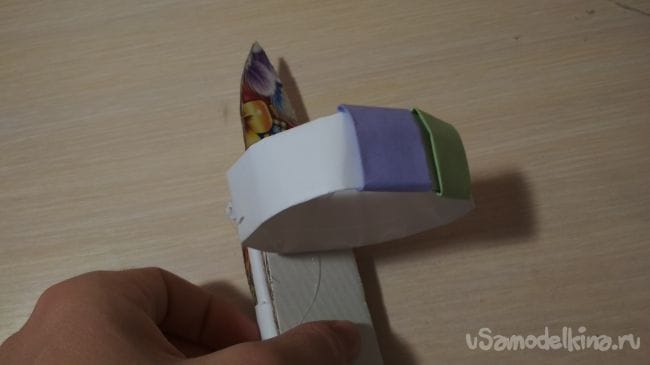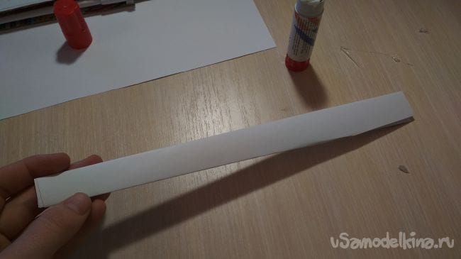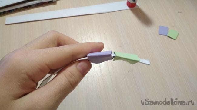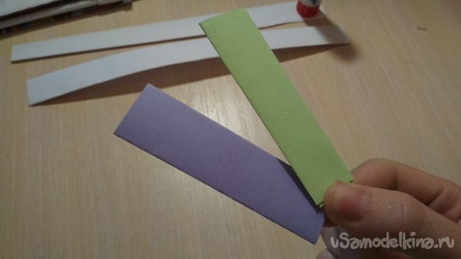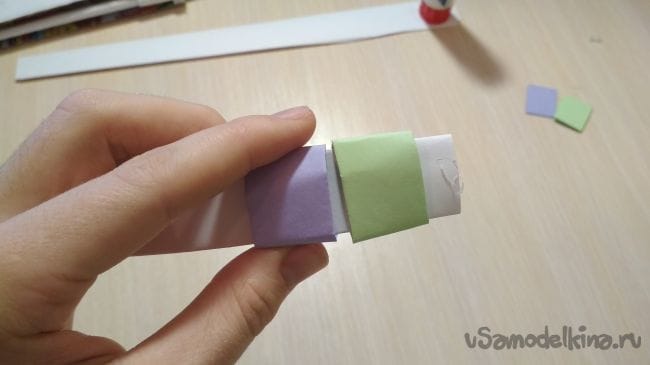 Затем берём одну из наших длинных полосок бумаги и приклеиваем к ней наши прошлые заготовочки, таким образом чтобы с одной стороны мог пройти другой конец длинной полоски из бумаги: