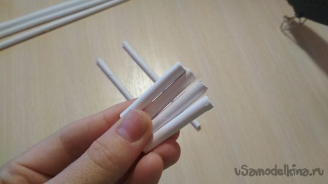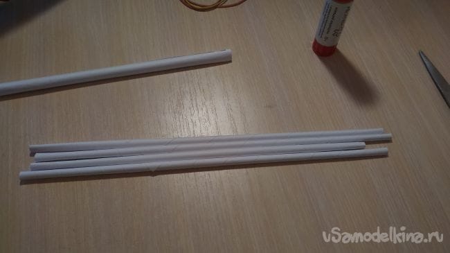 Затем другую тонкую трубочку разрежем на 4 одинаковые части по 3 см: