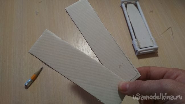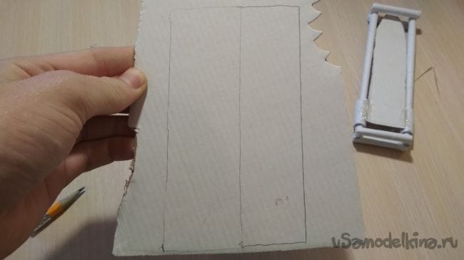 Снова берём картон и чертим на нём два прямоугольника такой же длинны что и клинок, один прямоугольник шириной 3 см, а второй 2,5 см: