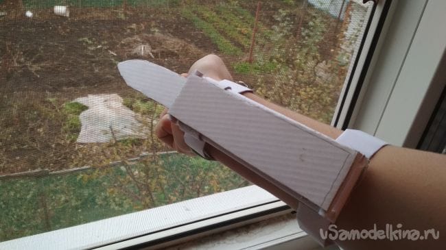 Ну вот и всё! Наш "клинок" Ассасина готов и осталось его только протестировать, для этого просто надеваем его на ту руку на которую вам удобно, затягиваем переднее крепление и всё! Осталось только резко взмахнуть рукой в низ и картонный клинок резко выдвиннится.