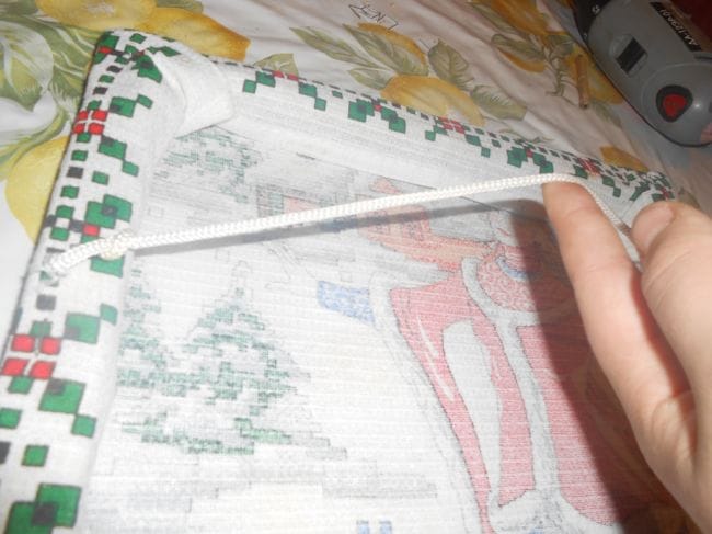 9.Шаг. Ну осталось только прикрепить веревочку чтобы подвешивать на гвоздик . Делаем это с помощью того же степлера . Когда мы прикрепим веревочку к самой рамки , но если она будет выскальзывать то просто завяжем узлы по краям . Как на фото .