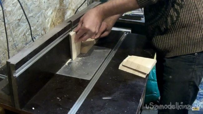 Далее делаем паз в каждой дощечке угловой фрезой на фрезерном столе.