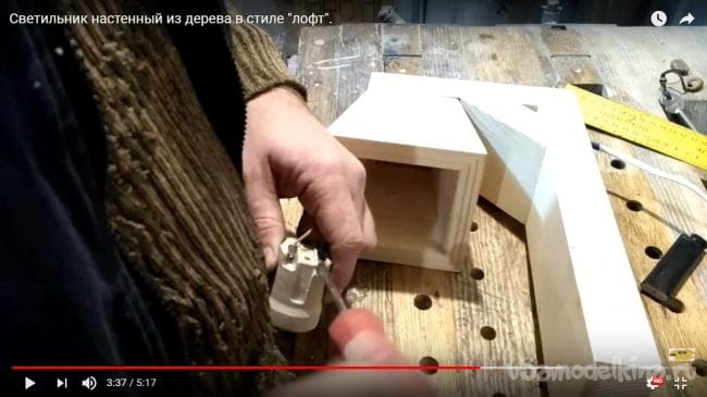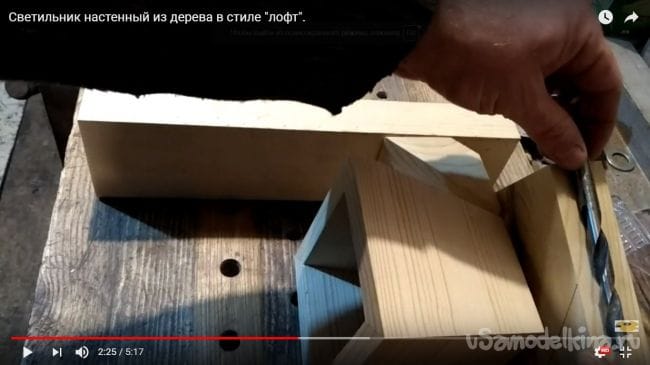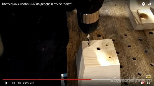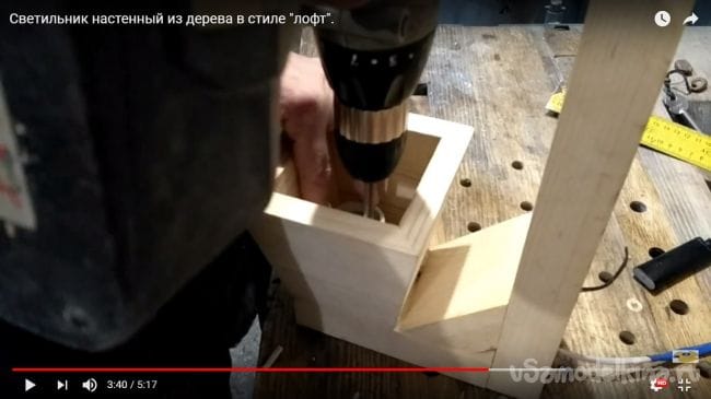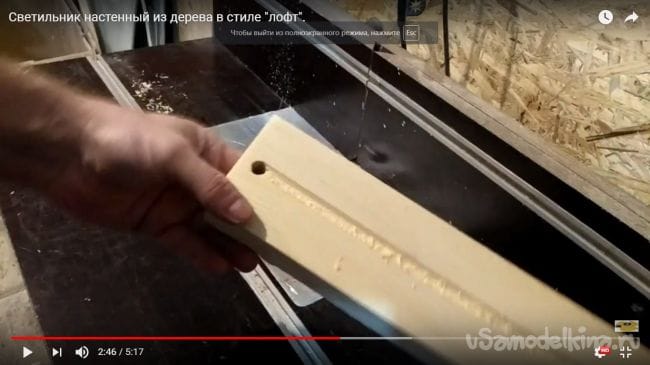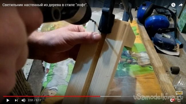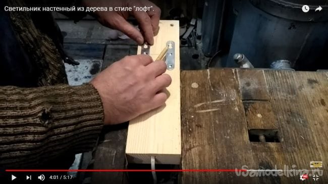 В дощечке, которая будет крепиться к фонарю с лампочкой нужно просверлить отверстие, которое предусмотрено для того, чтобы спрятать там провод, идущий к патрону.