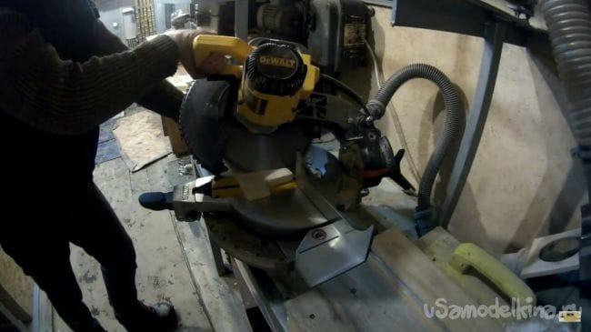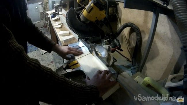 Первым делом нужно распилить доски, которые будут собраны в единое целое в виде квадрата. Для этого распиливаем четыре одинаковых по длине доски на распиловочном станке, пилить необходимо под углом 45 градусов, чтобы потом состыковать их между собой.