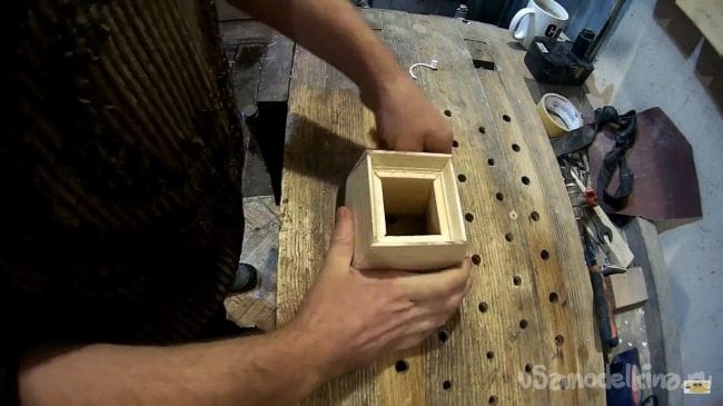 Чтобы на соединение двух досок под 90 градусов не действовала большая нагрузка, а также в целях упрочнения конструкции было принято поставить маленький упор между двумя дощечками, который в свою очередь был закреплен при помощи клея.