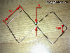 Можно сказать прототип, рефлектор из фольгированного стеклотекстолита. Шпильки на краешках рамки из той же проволоки – в этих местах нулевой потенциал и допускается использовать металлический крепёж, что удобно. По идее, стоит стремиться к хорошей симметрии рамки и правильности (соответствии расчетной форме), чего при изготовлении из толстой проволоки не так просто добиться. На ум приходит простая оснастка, хотя бы в виде деревянного «кубика», поместив который внутрь рамки можно деревянной же или резиновой киянкой, без фанатизма, подровнять углы и форму плечей.
