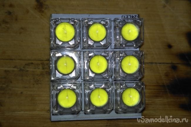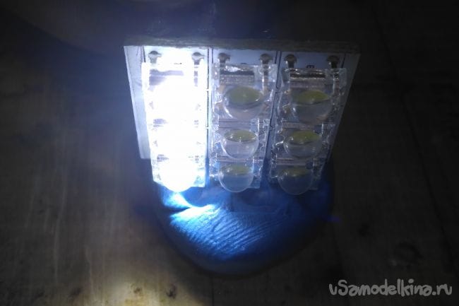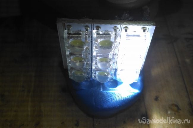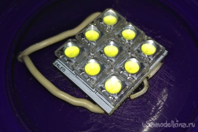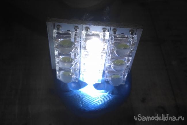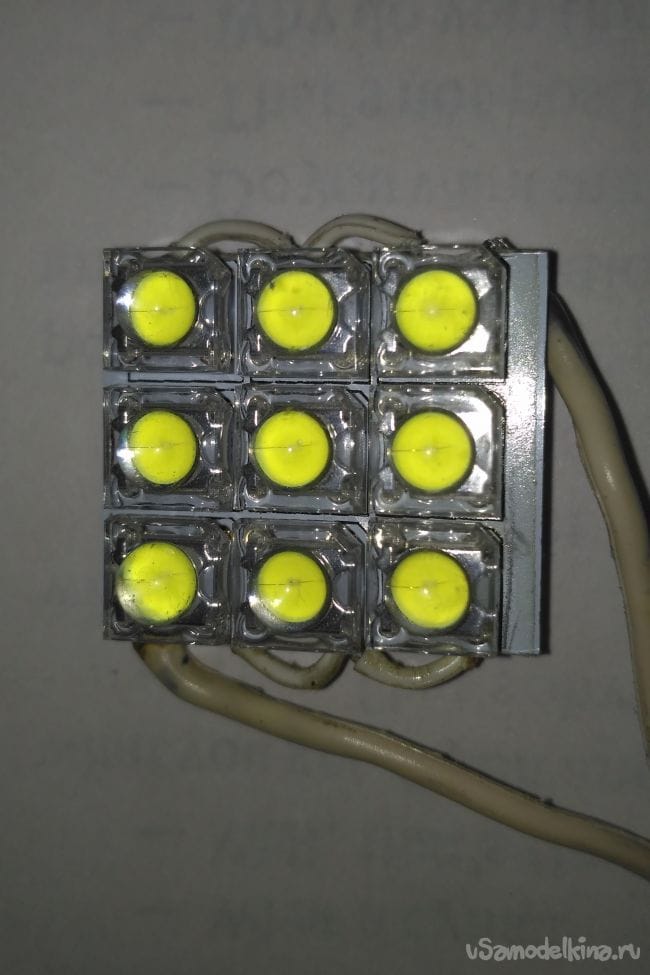Шаг 4: Приступаем к пайке и пробному включению. Сначала я спаял светодиоды в три группы по три штуки и проверил на работоспособность. Все горят — продолжаем дальше (Паять я не особо умею, так что не судите строго).