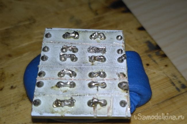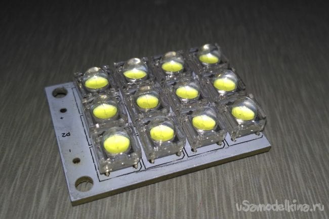 Шаг 3: Вместо отдельных светодиодов, я взял панель с уже припаянными, не помню откуда она взялась, но выглядела подходяще. Для симметричности отрезал 3 лишних диода и получилась квадратная плата с тремя рядами светодиодов. При подключении оказалось что на панели под краской имеются дорожки и они мешают запитать все светодиоды в раз. Видимо изначально они включались группами или с какой-то иной хитростью. Пришлось прорезать канцелярским ножом, на обратной стороне тонкие борозды, чтобы нарушить дорожки и перепаять схему по своему. Саму плату резал этим же канцелярским ножом (прорезаешь с обоих сторон по неглубокой борозде, а потом просто отламываешь плоскогубцами)