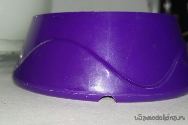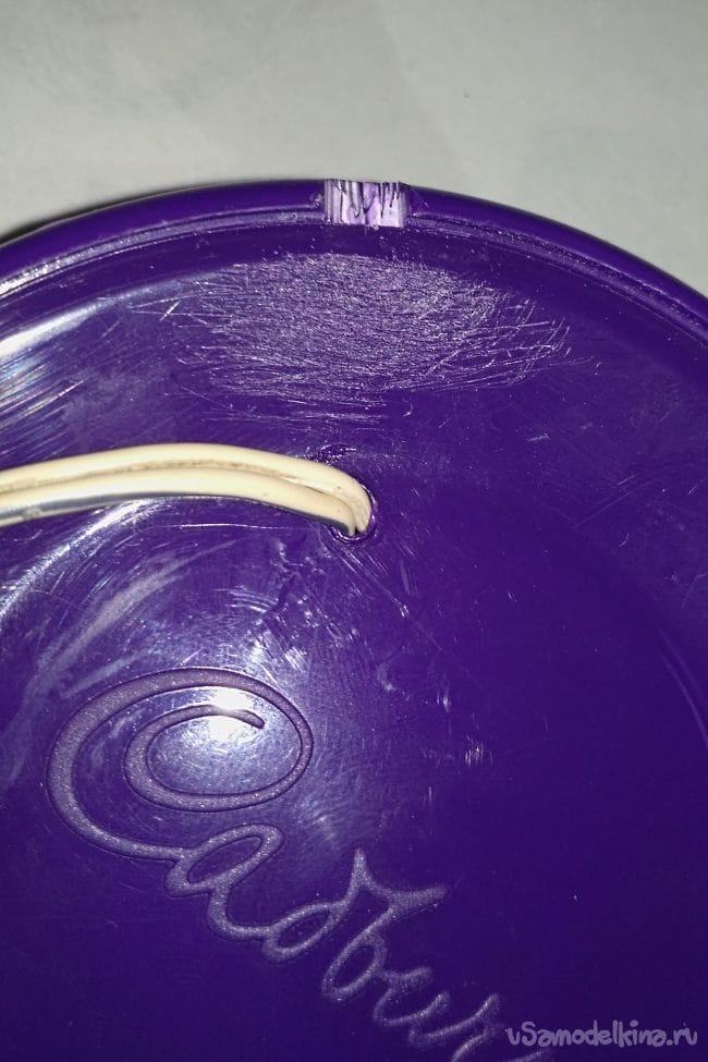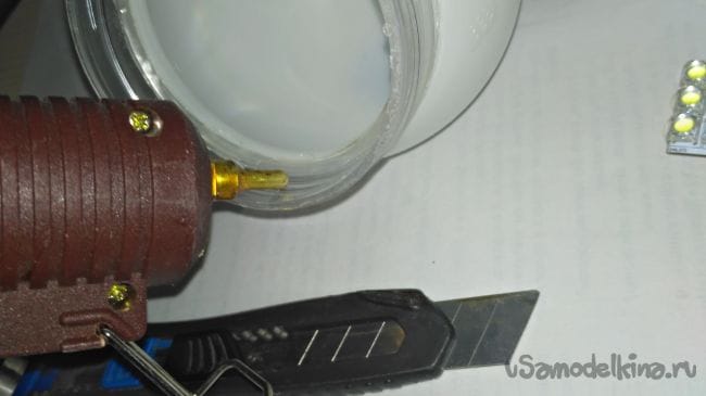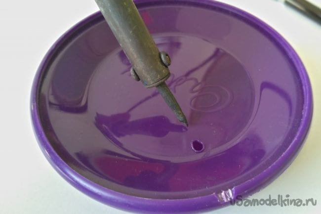 Шаг 5: Делаем в крышке снизу два отверстия под провод. Первое — внутрь светильника, его я просто прожёг паяльником, хотя можно и просверлить. А второе, вырезал канцелярским ножом.