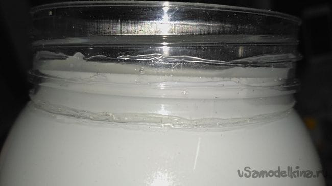 Плафоны различались длинной «юбки» (нижней кромки) Взял тот, где припуск был побольше, для более надёжного склеивания с горловиной банки. Чтобы термоклей на холодном стекле застывал помедленней, я налил внутрь плафона горячей воды из чайника, а потом стал не спеша наносить термоклей из пистолета и насаживать на него горловину с резьбой (плафон предварительно лучше обезжирить спиртом). Так, у меня была возможность примерить крышку и выровнять все зазоры. Потом воду вылил и охладил плафон под краном. Сам процесс склеивания сфотографировать не получилось, так как руки были заняты.