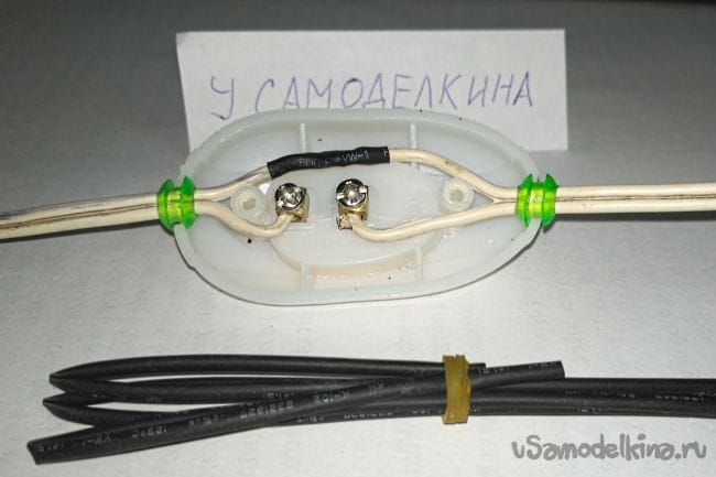 Соединяем всё в одну цепь и делаем выключатель. Я отмерил 20 см от светильника до выключателя, чтобы кнопка располагалась на уровне кровати, так, чтобы находить его на ощупь даже в темноте и не тянуться до тумбочки. На этом этапе можно уже увидеть, как ночник будет светить.