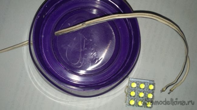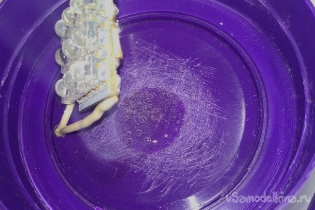 Для надёжности, зачищаем крупной наждачкой внутри крышки площадку для приклеивания светодиодов и снаружи для крепления провода. Наносим термоклей и прижимаем. Проверяем не торчит ли где клей, осматриваем на предмет косяков и прочих недочётов.