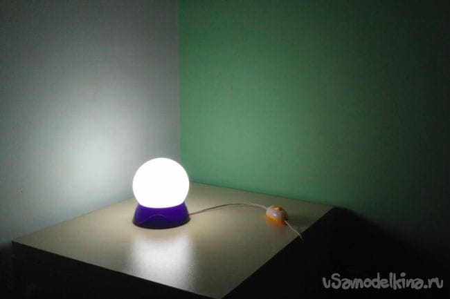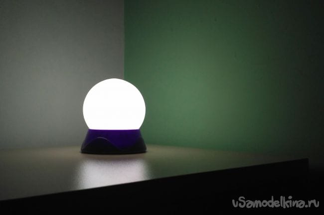Заключение: Внутри крышки, вокруг светодиодной панели, можно установить кольцо из непрозрачного материала, например картона. Я сначала так и задумывал, чтобы светился только плафон, а цоколь вообще виден не был, но оказалось что с лёгким свечением фиолетового основания, ночник выглядит даже лучше. Светильник, кстати говоря, получился полностью герметичным (если конечно проклеить место входа провода) его можно использовать в ванной комнате, или даже под дождём на природе, если разместить внутри аккумулятор, место там вполне позволяет.