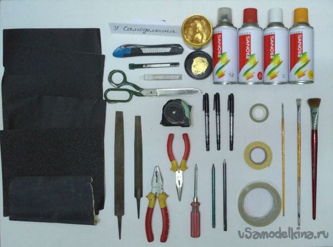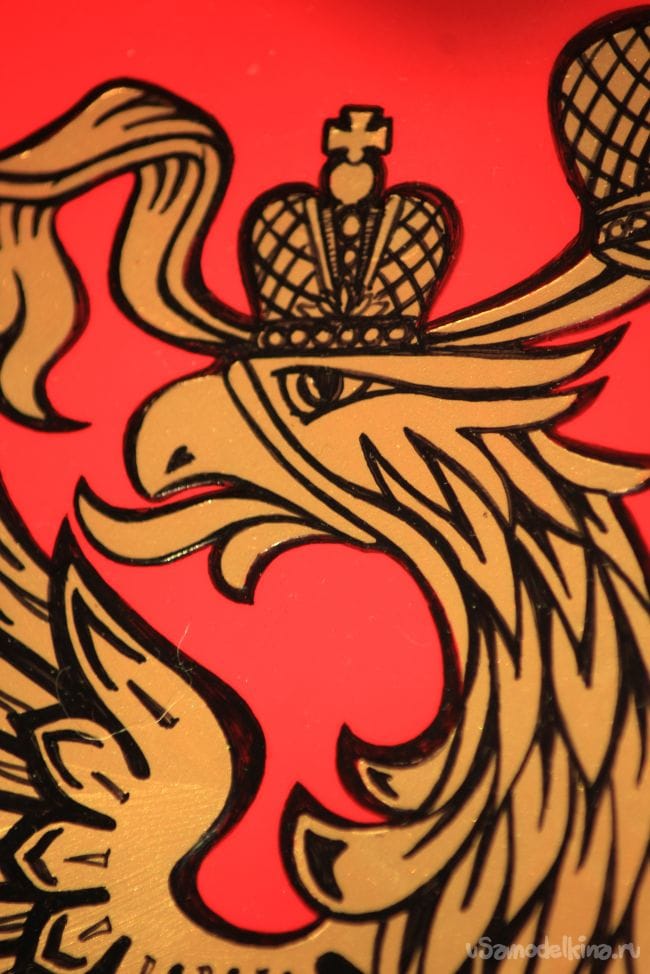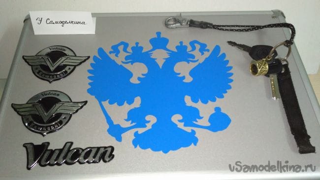 Вообще можно это нарисовать на компьютере за вечер и вырезать на плотере за час, наш же проект делался за границей и многое что в России легко решалось бы за пару минут, здесь создавало серьёзные проблемы. Просто было разве что с орлом на баке — я нашёл картинку в векторном формате (кстати скачал с сайта кремля) и заказал плотерную резку в рекламной студии. Так как нужен мне был только контур, самого орла я приклеил на ящик с инструментами. Получилось что самый сложный трафарет сделали за 2 минуты.