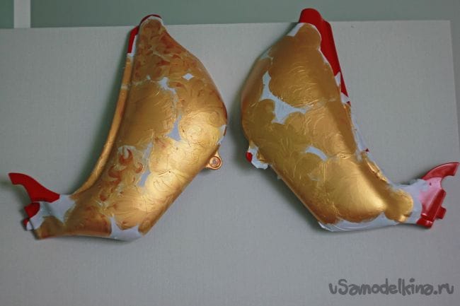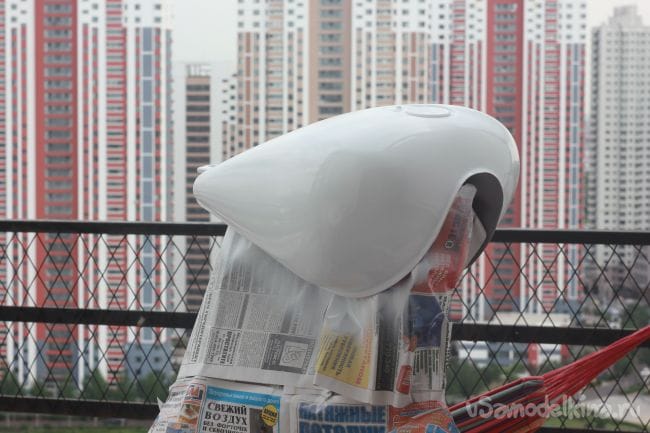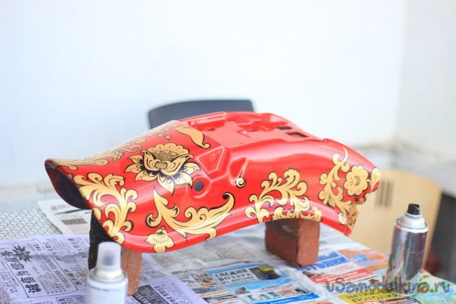Научившись на своих ошибках, я решил отказаться от лака в балончиках. Потому что на этом этапе предстояло нанести крайний слой всего покрытия и если он будет сохнуть год, я просто не выдержу, одену детали на мотоцикл и конечно же испорчу всю проделанную работу. И так как краскопульта у меня небыло, а наносить автомобильный лак кистью было просто глупо, пришлось отвезти детали на СТО и заплатить за нанесение нескольких слоёв лака и сушку. По рыночным расценкам с меня взяли совсем недорого, но относительно всех затрат на проект очень ощутимо.
