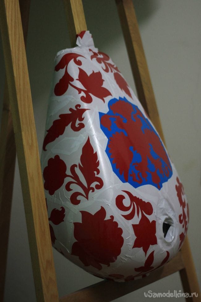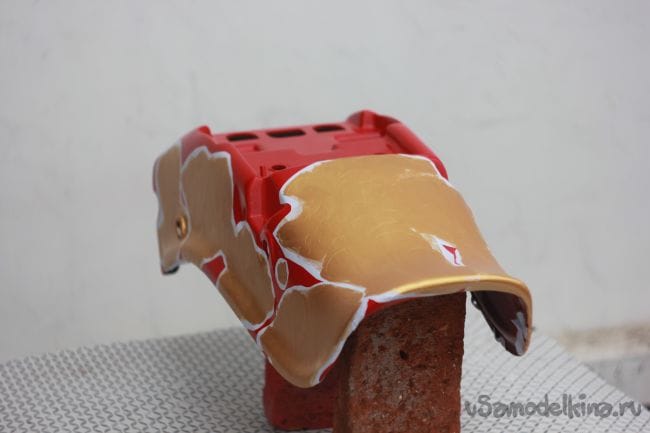 Золотую краску наносили кистью длинными мазками. Излишки краски между слоями снимал наждачкой после высыхания, орудуя шкуркой прямо поверх самоклейки (наждачка 1200cw). На финишном слое специально сохранил текстуру от кисти, чтобы рисунок выглядел «богаче». Понадобилось три слоя, кое-где четыре, чтобы красный фон перестал просвечивать. Крайний слой лучше не досушивать до конца, так будет легче снимать трафареты.