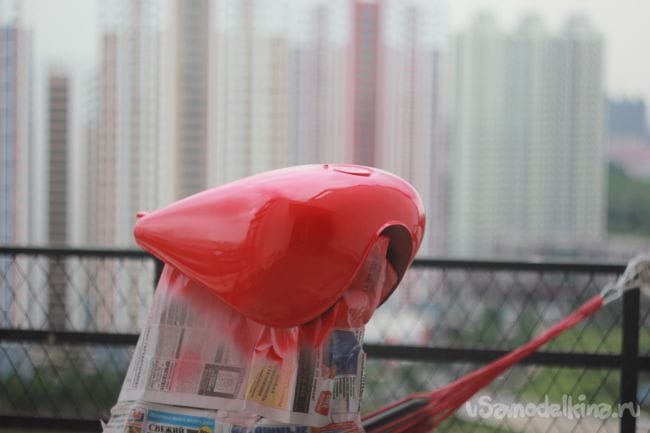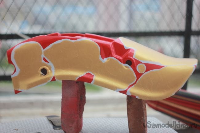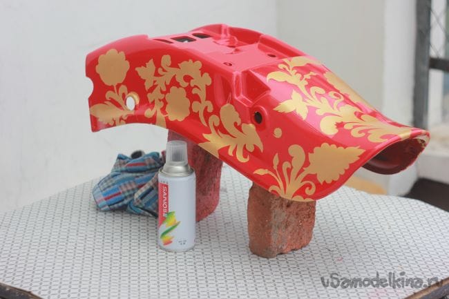 Первым, наносил белый слой, чтобы основной красный как бы светился и вообще был ярче. Белого хватило одного слоя, а вот красный уже ложил в три. Краску купил в балончиках (самую дешевую) о чём позже неоднократно пожалел, но ничего более подходящего найти просто не удалось. В итоге могу сказать что краска Sanol вполне хорошо ложится, и вообще к нанесению никаких нареканий не возникло. А вот высыхает эта зараза примерно год-полтора(тогда я этого ещё не подозревал) и я нисколько не шучу! Может в ультрафиолетовой сушильной камере можно высушить её и в десяток раз быстрее, но в моём распоряжении был только застеклённый балкон.