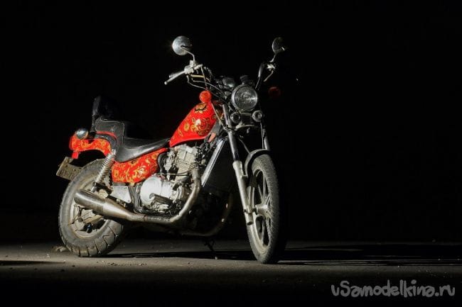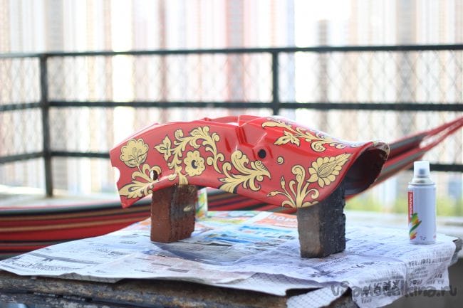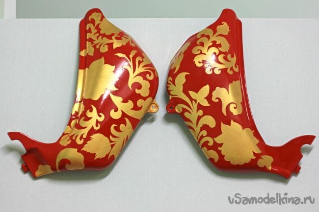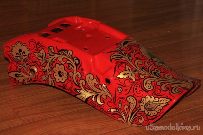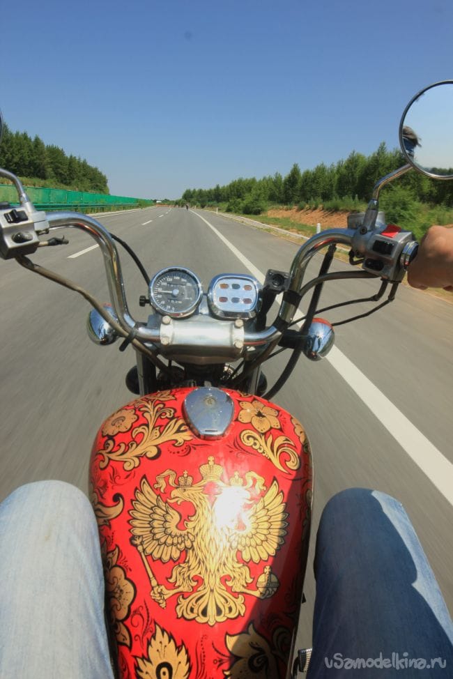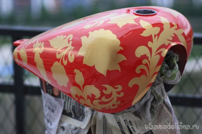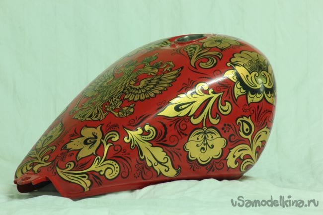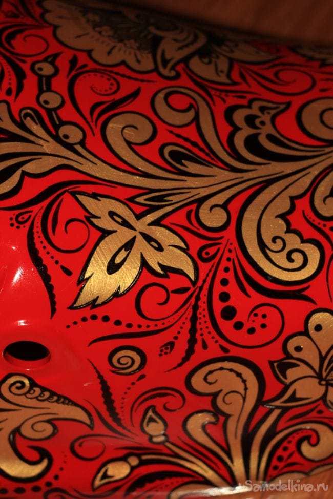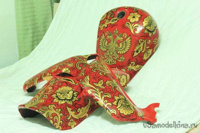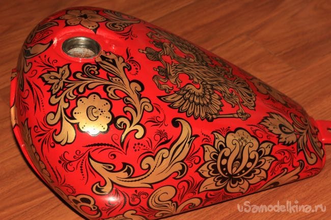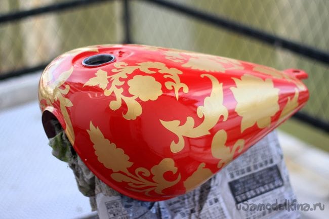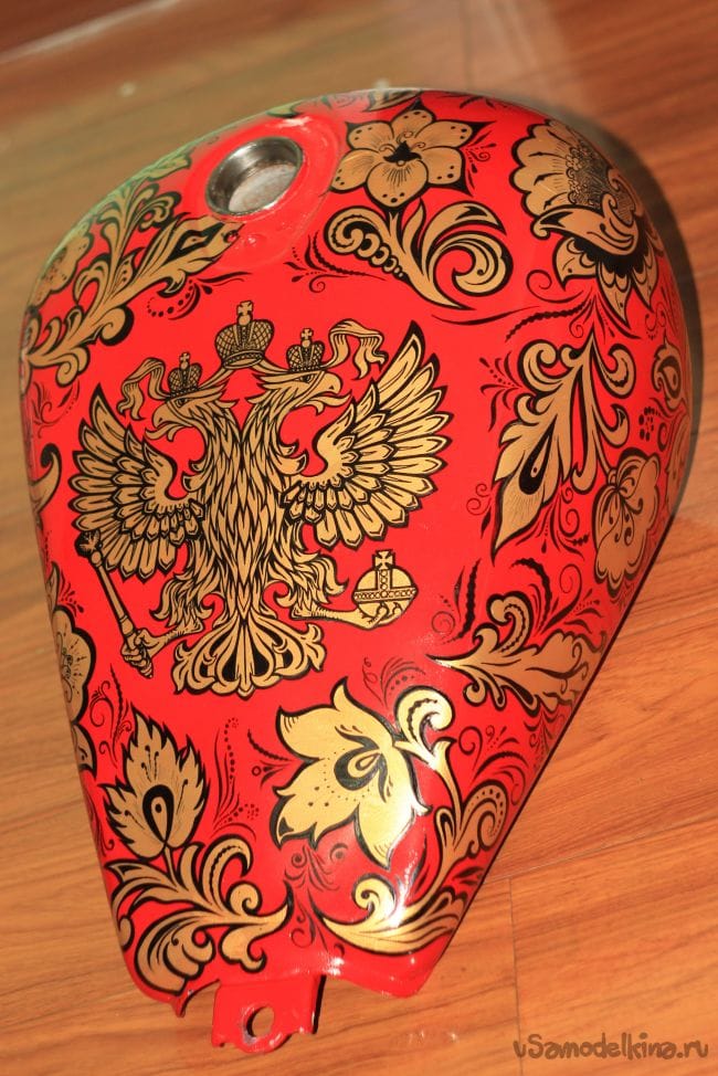Идея перекрасить мотоцикл возникла от наличия свободного времени и желания что-нибудь сделать руками. Да и мотоцикл хотелось как-то выделить из общей массы транспорта на дорогах. В итоге решил сделать рисунок в стиле хохломы, можно сказать по мотивам русской народной живописи. Живя за границей очень скоро начинаешь скучать по Родине и всему русскому, хочется чего-то своего родного. Начав делать проект, я представлял его как жёлтый узор на красном фоне, простой, крупный и не очень затейливый, чтобы можно было всё сделать в домашних условиях без специального оборудования и инструментов. Что из этого получилось в итоге, читайте далее...