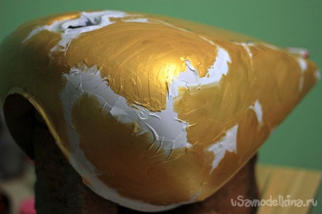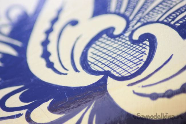 Аккуратно, без резких движений снимаем плёнку, вооружившись канцелярским ножом. Акриловая краска, если резко потянуть трафарет может отслоиться, особенно в местах где слой толстый — в таких местах подрезаем краску по контуру ножом. И сразу же проверяем и удаляем случайные пятна золотой краски, если таковые образовались в процессе работы. Можно аккуратно счищать их ножом, а можно оттирать водой (акрил растворяется водой), но как показала практика ножом проще и удобнее.