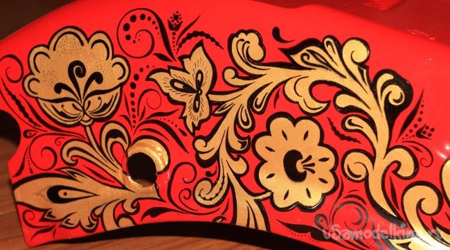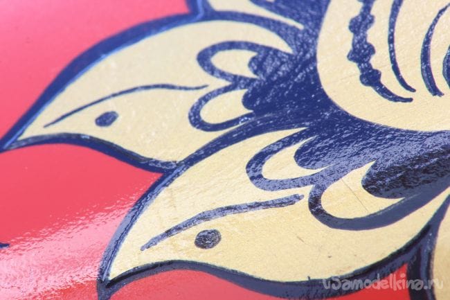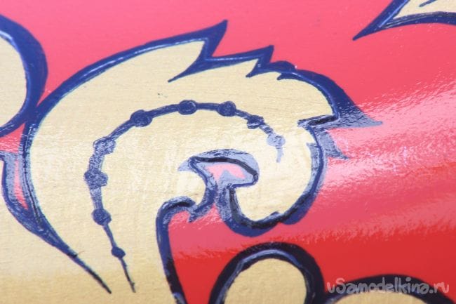 Но вернёмся к технической части. Сначала на всех элементах мы обвели узоры по периметру, а потом начали «раскрашивать» мелкими деталями и всяческими завитушками. А когда закончили нам показалось что промежутки между узорами, тоже стоит заполнить узорами. Это объединило все элементы в единую композицию, слегка приглушило красный и подчеркнуло золотистый цвета . Дальше на фотографиях будет видно насколько стало лучше. Собственно весь проект, так и рождался уже на ходу, а задумывалось всё сильно проще и вообще немного иначе.
