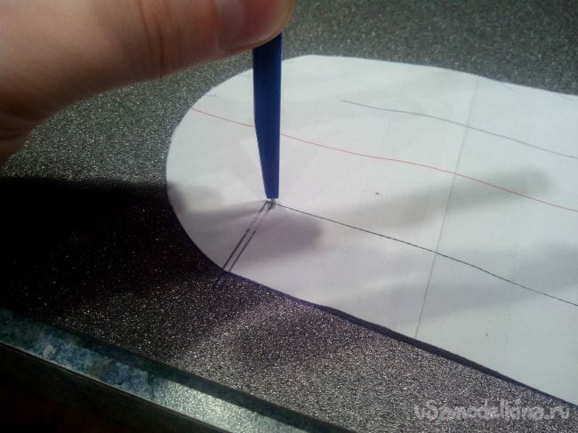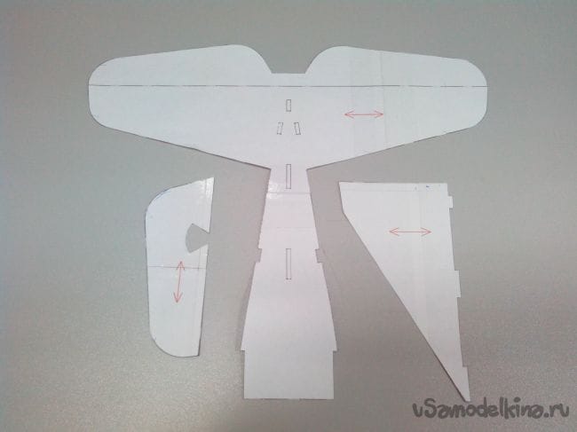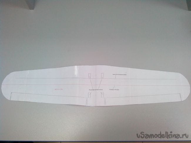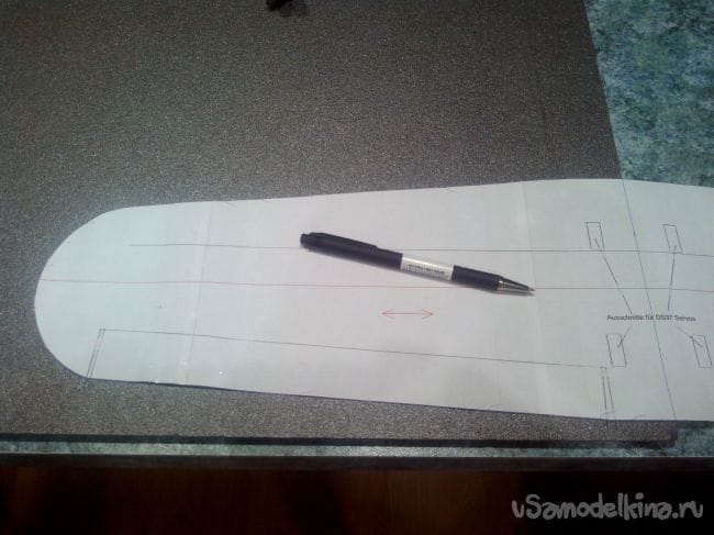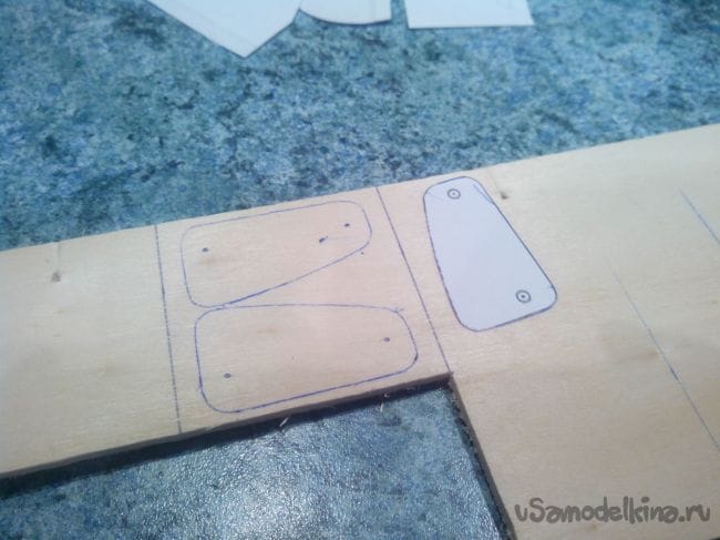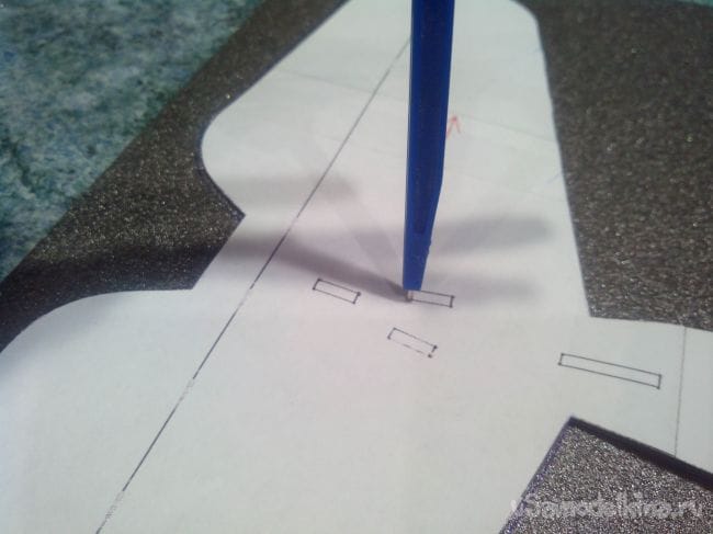 Местоположение уголков элеронов продавливаем острием циркуля или тонким шилом сквозь чертеж, а по краю делаем отметки ручкой.