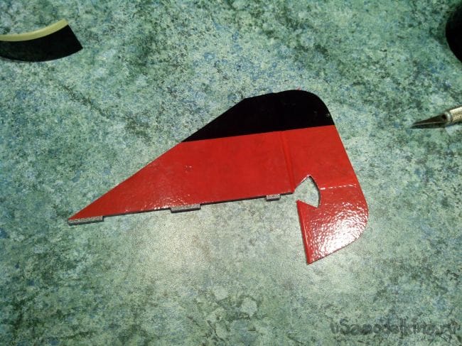 Киль и руль направления сошкуриваем с двух сторон и тоже вешаем руль направления на скотч, обклеивая в нужные цвета.