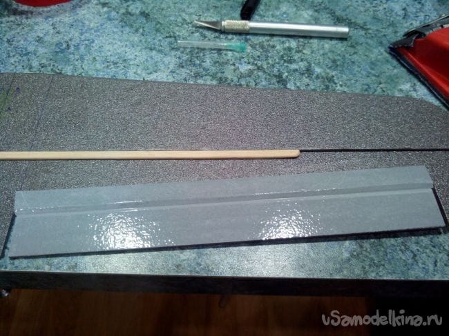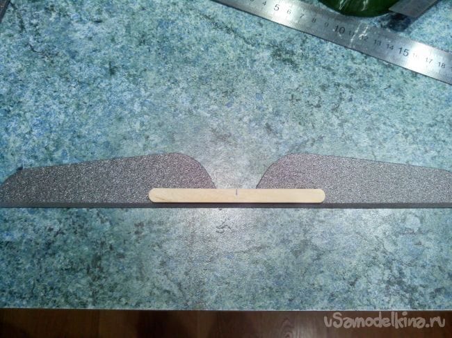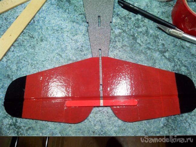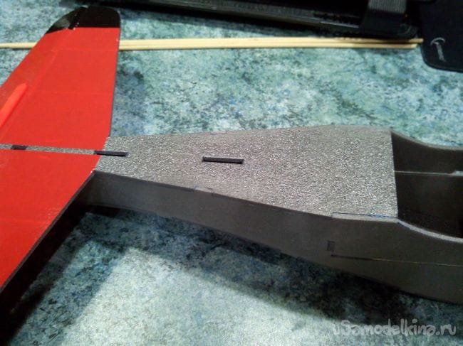 Отрезаем руль высоты и усиливаем половинки палочкой от мороженого.