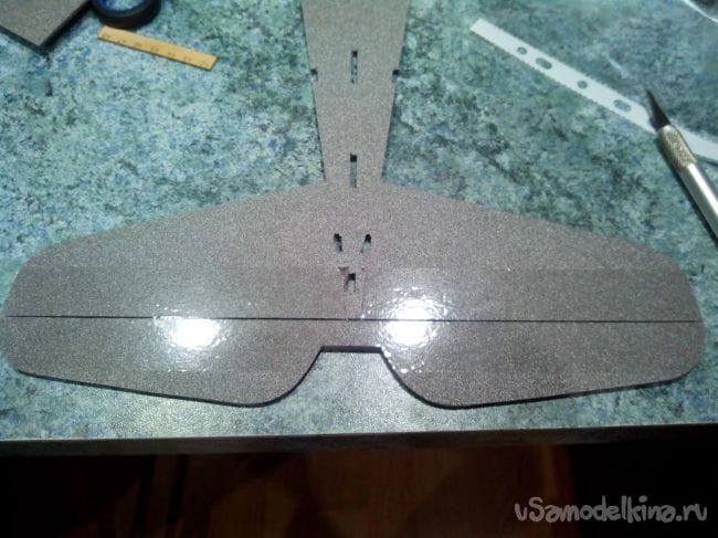 Обклеиваем горизонтальное оперение скотчем в нужной цветовой гамме (потом это будет делать уже сложней).