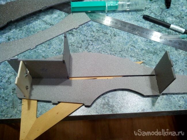 Передние стойки сразу вклеиваем в фанерные усиления клеем ПВА, предварительно рассверлив в них отверстия под нужным углом, и оставляем до полного высыхания.