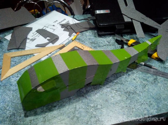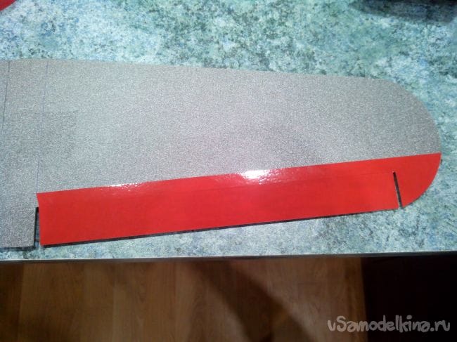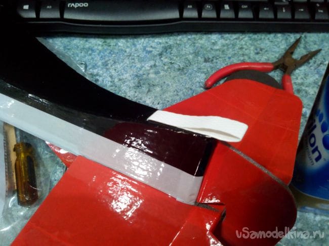 Обклеиваем фюзеляж цветным скотчем сверху.