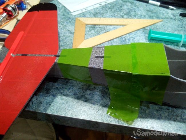 Элероны и задние кромки крыла сошкуриваем под углом 45 градусов и навешиваем элероны на скотч.
