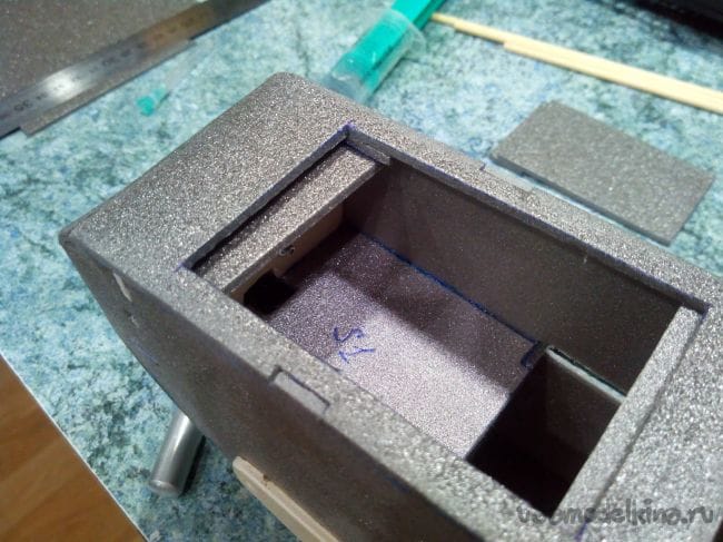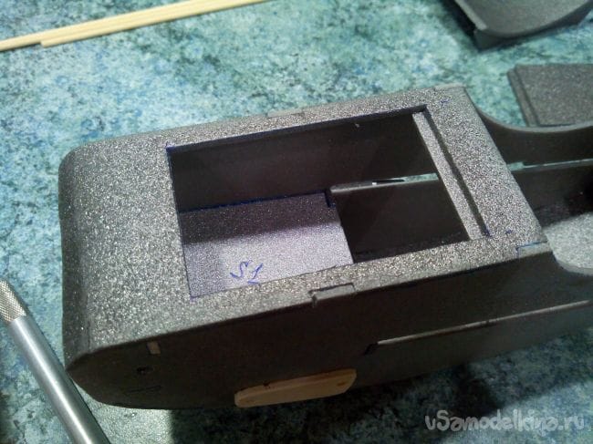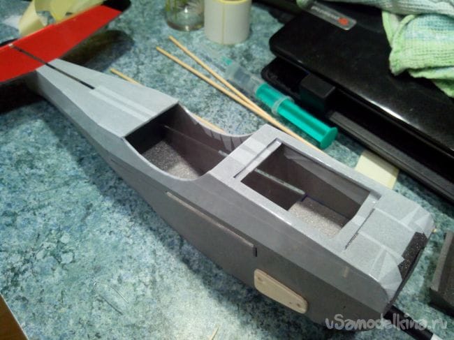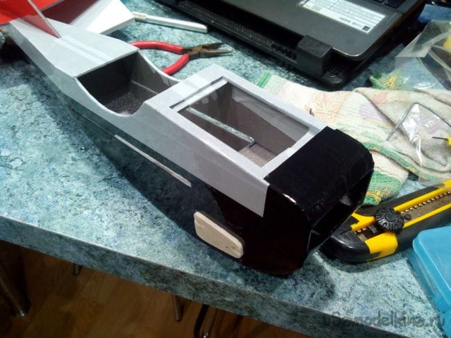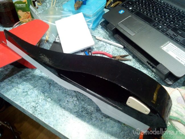 В носовой части сверху вырезаем люк для аккумулятора.