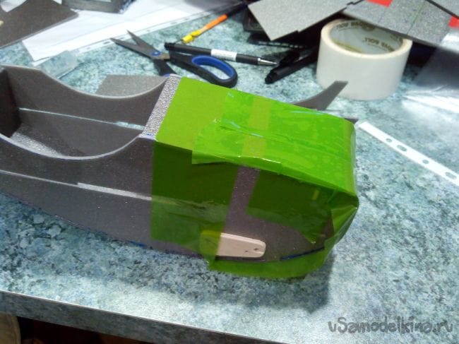 Заклеиваем верх носовой части и тоже фиксируем скотчем.
