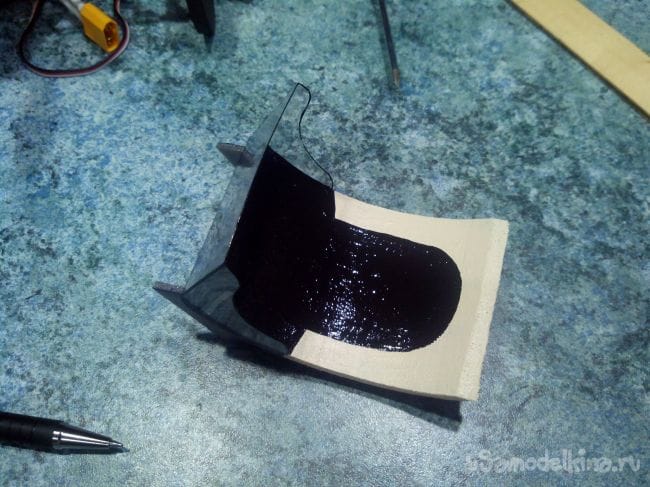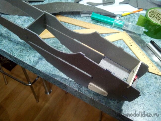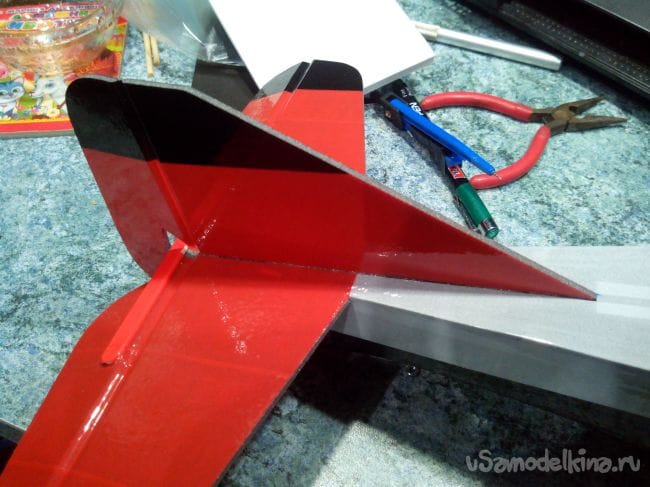 Вклеиваем киль в хвостовую часть. В нижней части руля направления добавляем в качестве петель пару полосок скотча.