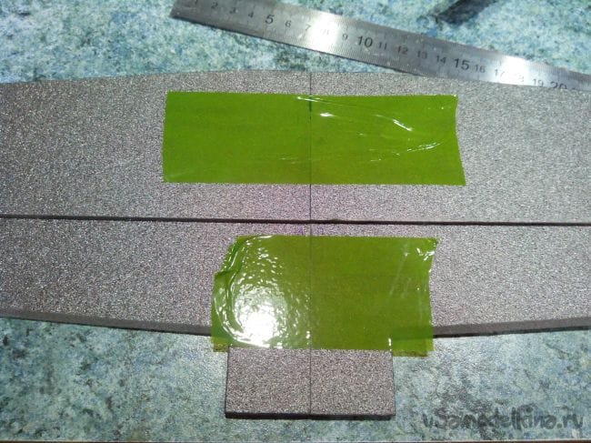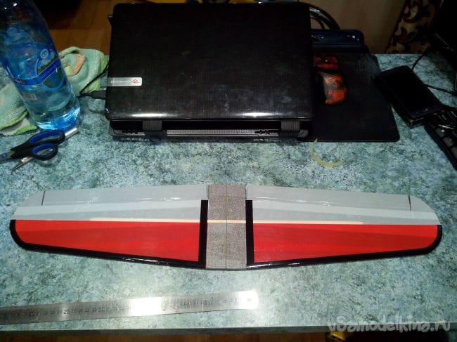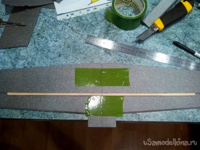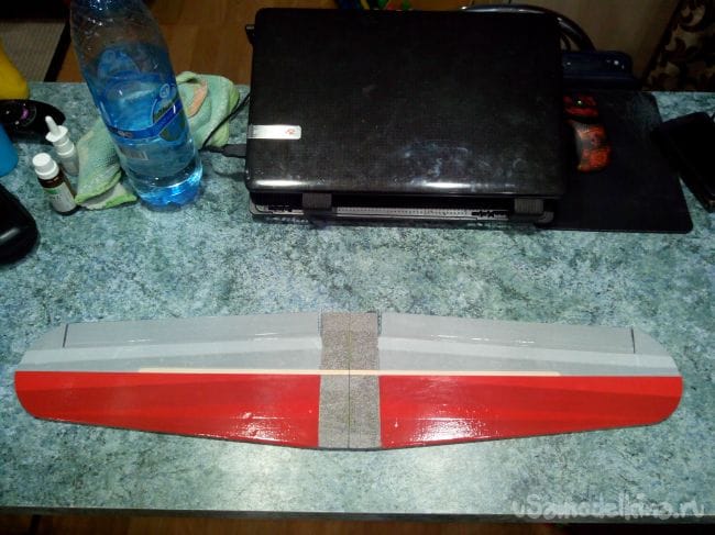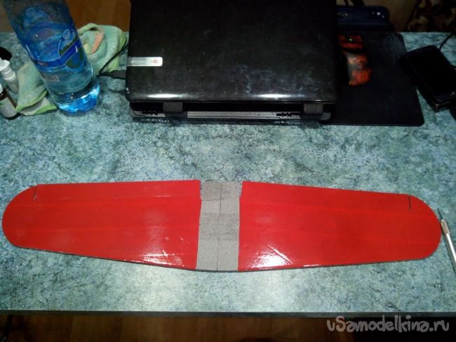 Склеиваем консоли вместе и фиксируем скотчем (с двух сторон, иначе крыло выгибается и плохо склеивается).