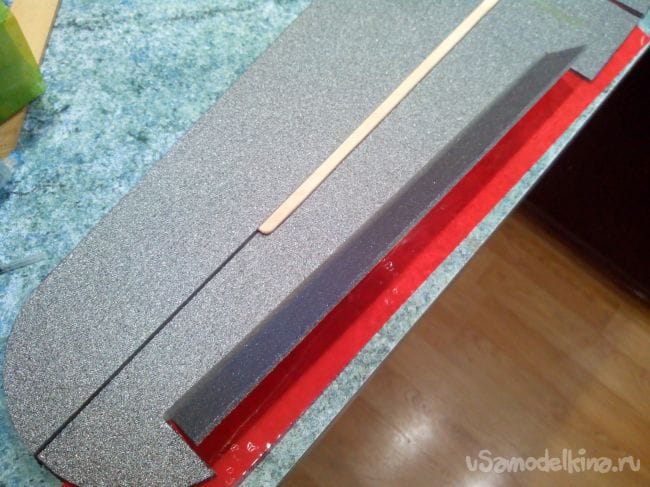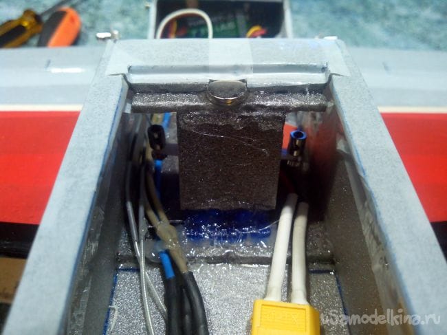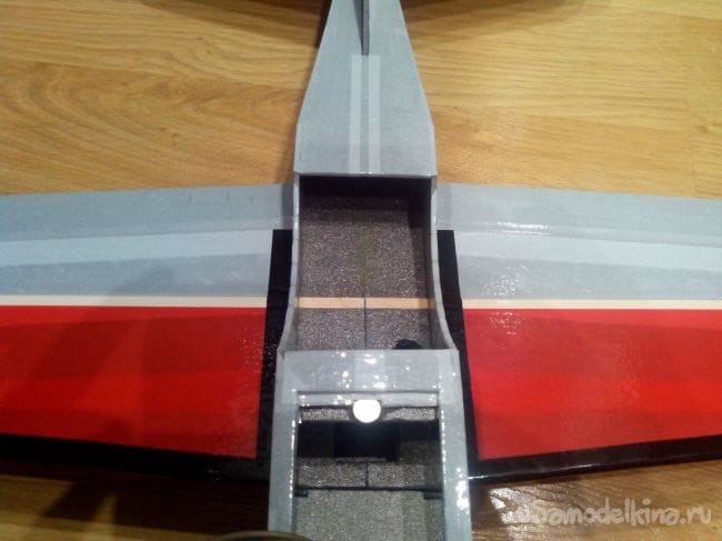 Вклеиваем перегородку из двух слоев депрона перед сервоприводами элеронов. Она нужна для того, чтобы аккумулятор не мешал движениям качалок сервоприводов. Кроме того, усилится достаточно тонкая перемычка, в которую вклеен магнит.