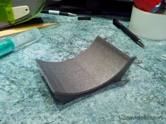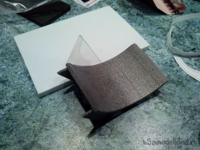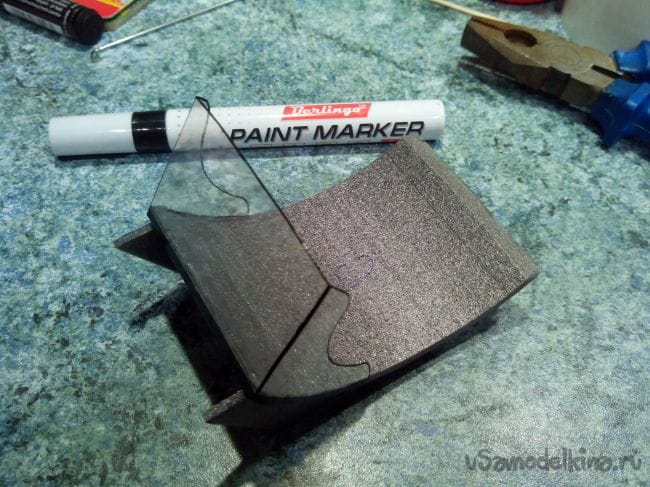 Из прозрачного пластика вырезаем ветровое стекло и наждачкой зачищаем места, где будет клей.