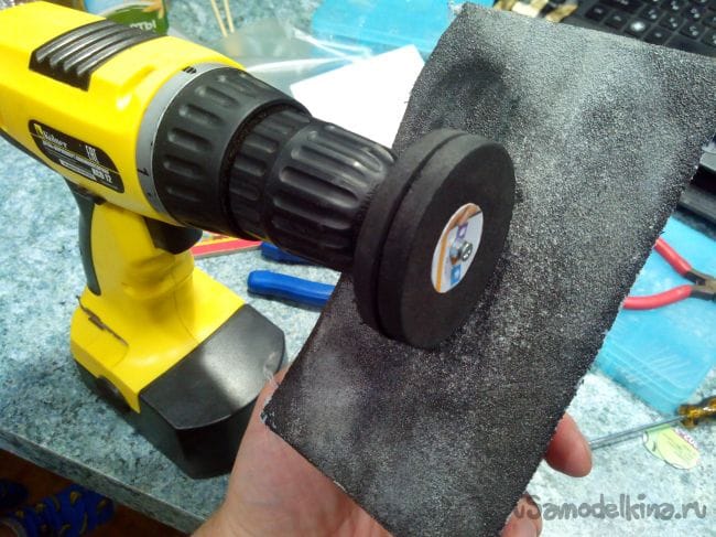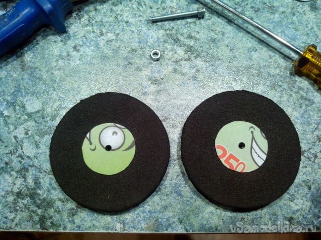 Болтом и гайкой стягиваем вместе обе заготовки, зажимаем в дрели и обрабатываем наждачкой, пока не получим два ровных и одинаковых круга.