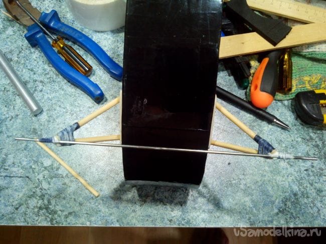 Вклеиваем задние стойки и до высыхания клея фиксируем их скотчем к передним стойкам. Затем вместо скотча обматываем места соединения стоек нитками с клеем.