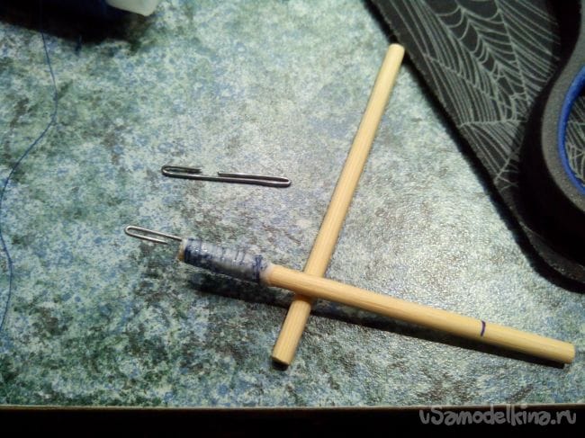 Из велосипедной спицы откусываем часть нужной длины и тоже нитками с клеем приматываем к «ушкам».