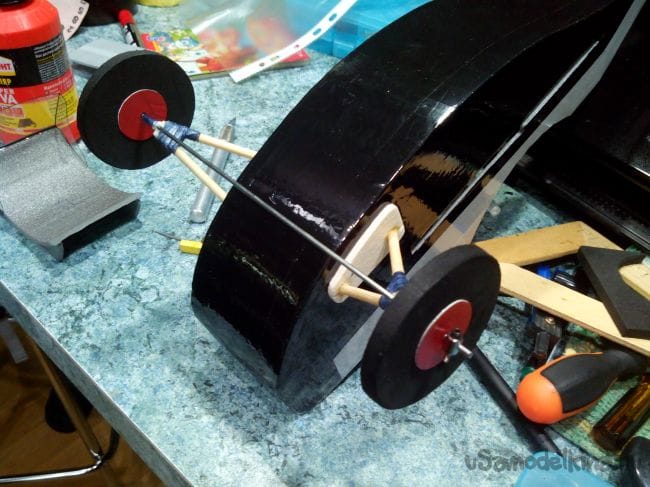 Колеса крепим фиксаторами тяг. Можно заменить фиксаторы трубочками термоусадки или обмотать нитками с клеем.