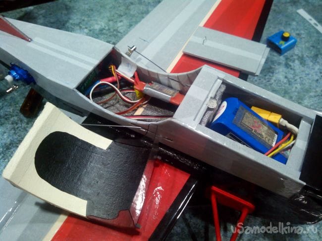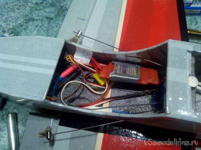 Вклеиваем кабанчики в элероны и через вырезанные в боковинах фюзеляжа щели проводим тяги к качалкам сервоприводов. Укладываем регулятор оборотов и приемник.