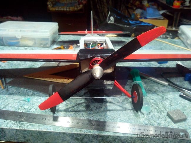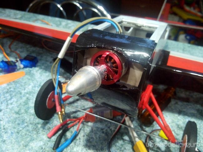 Прикручиваем мотор, а отверстия под отвертку на боковинах фюзеляжа заклеиваем кусочками скотча.
