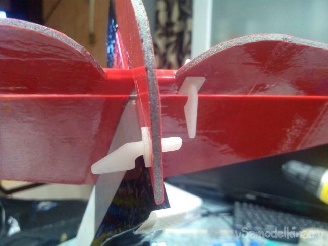 Шкуркой стачиваем край руля высоты и край стабилизатора под углом 45 градусов. Затем навешиваем руль высоты на скотч.
