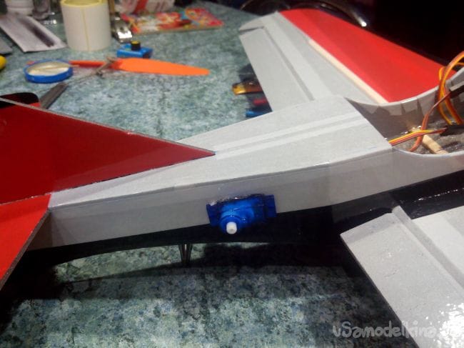 Вклеиваем хвостовые сервоприводы. На чертежах они располагаются внутри фюзеляжа ближе к носу, но у меня центровка получается очень передней, а потому пришлось выносить их наружу и смещать ближе к хвосту.