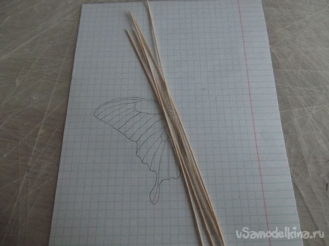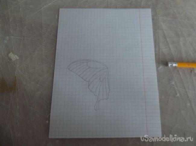 На ней изображен орнитоптер - бабочка( фото со стороны). И снизу было сравнение траекторий полета бабочки и орнитоптера ( к моему великому удивлению, они были одинаковые). Но самое главное было то, что сбоку располагалась схема крыла бабочки. И на том крыле были нарисованы предполагаемые ребра жесткости. Материал ребер как я понял - какой-либо аналог карбона. Но, так как карбон - вещь дорогая, решил я делать ребра из бальзы.