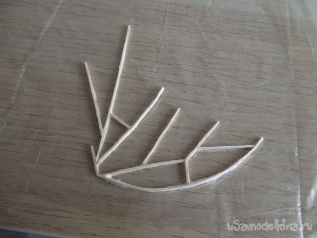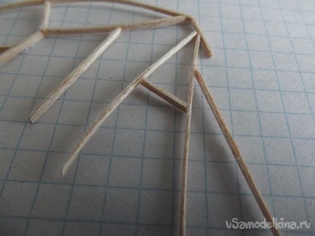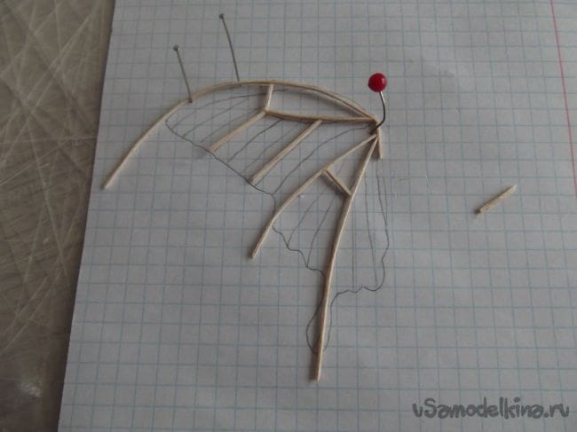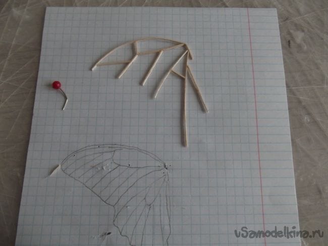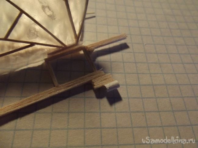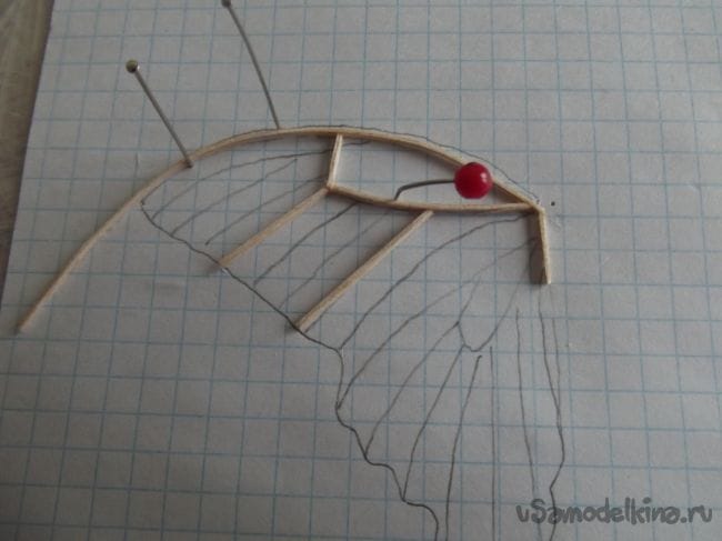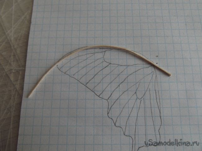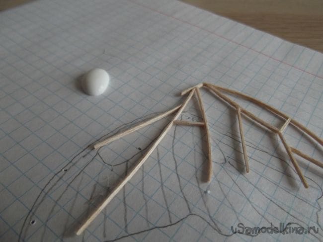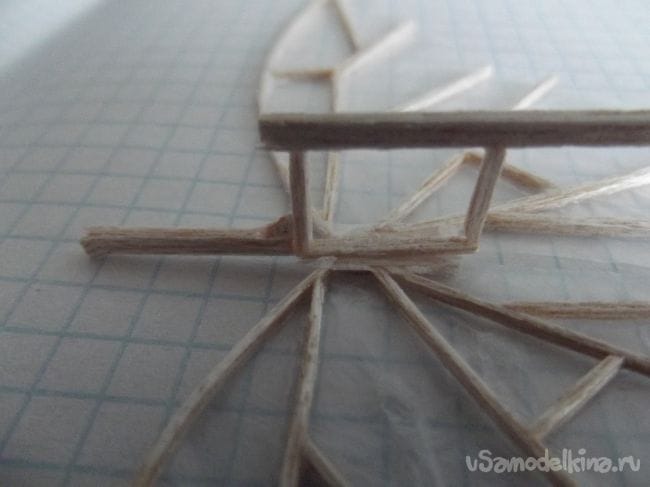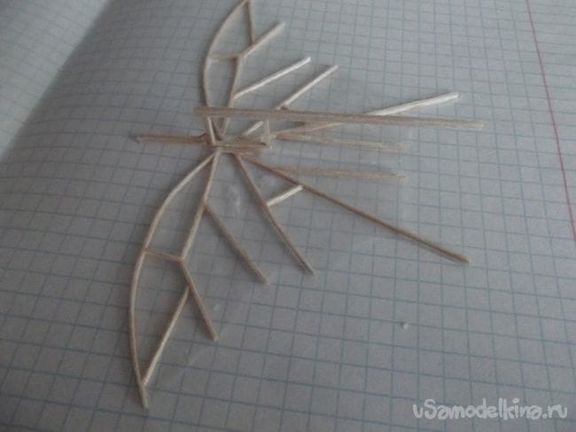 Теперь настала самая тяжелая работа: надо согнуть бальзу, нарезать из реек подходящие детали и склеить их вместе строго по чертежу. На это меня ушло пол часа: они ломались, трескались, отклеивались о общего каркаса ( для большего удобства, я вставлял булавочки , чтобы придать рейкам более совершенную форму)